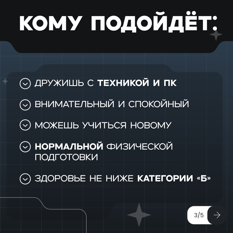 Обучение: первые два месяца интенсивного курса подготовки работе с современными беспилотниками, новейшими технологиями и оборудованием.